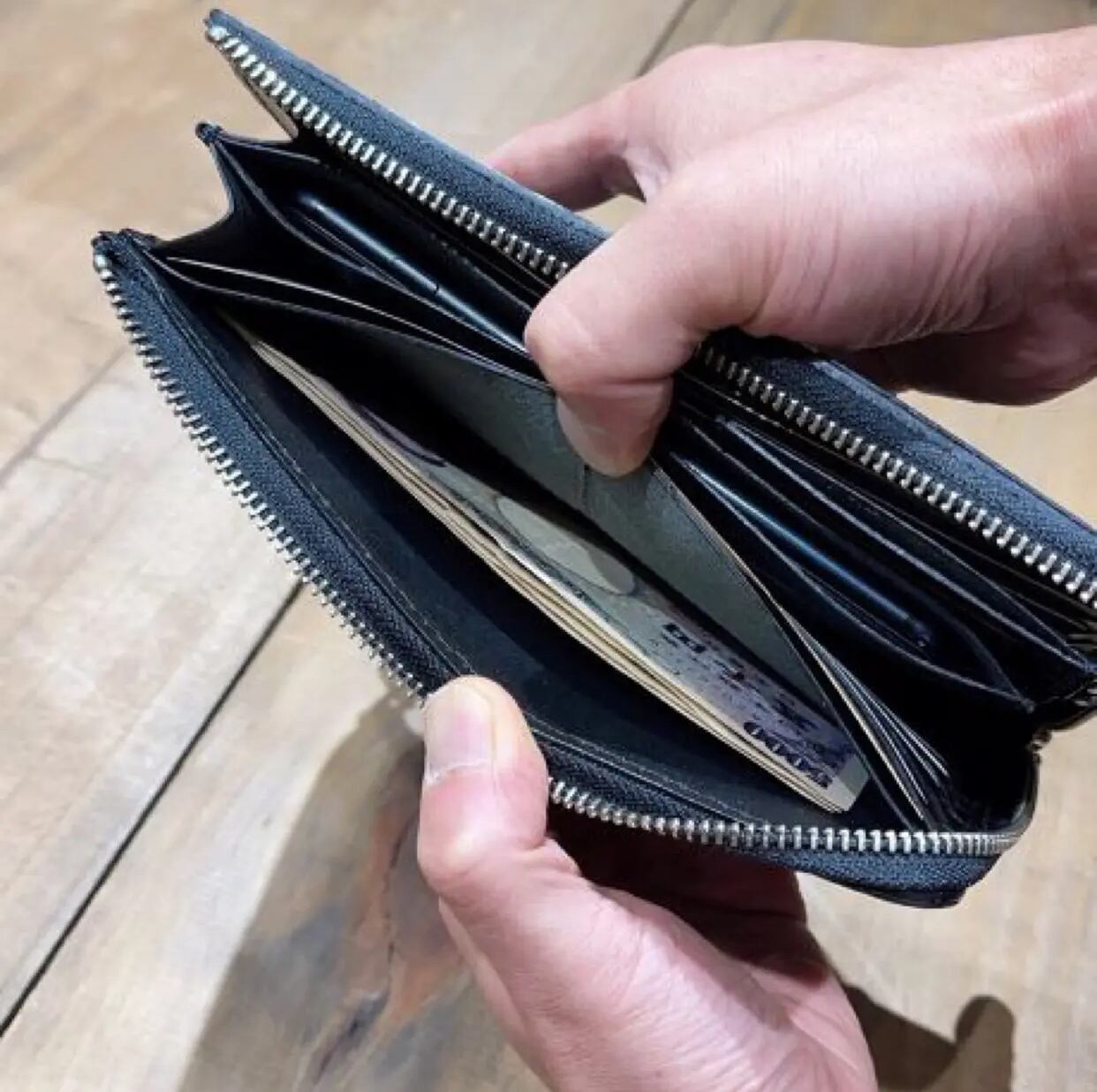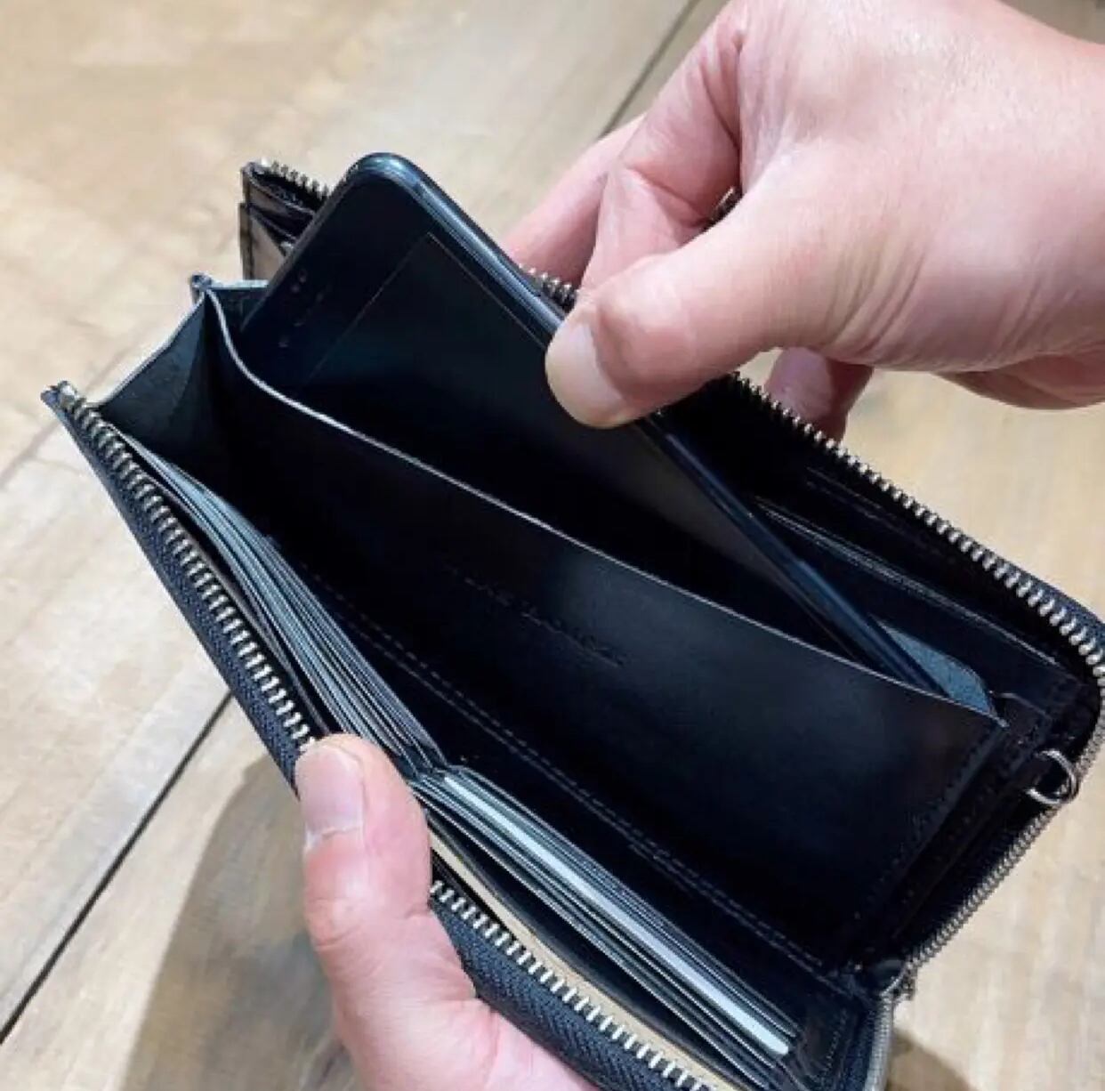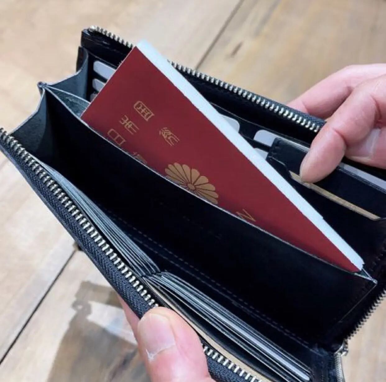 中央にはスマホやパスポートを入れられるスペースあり、L字ファスナーで開閉もスムーズ。